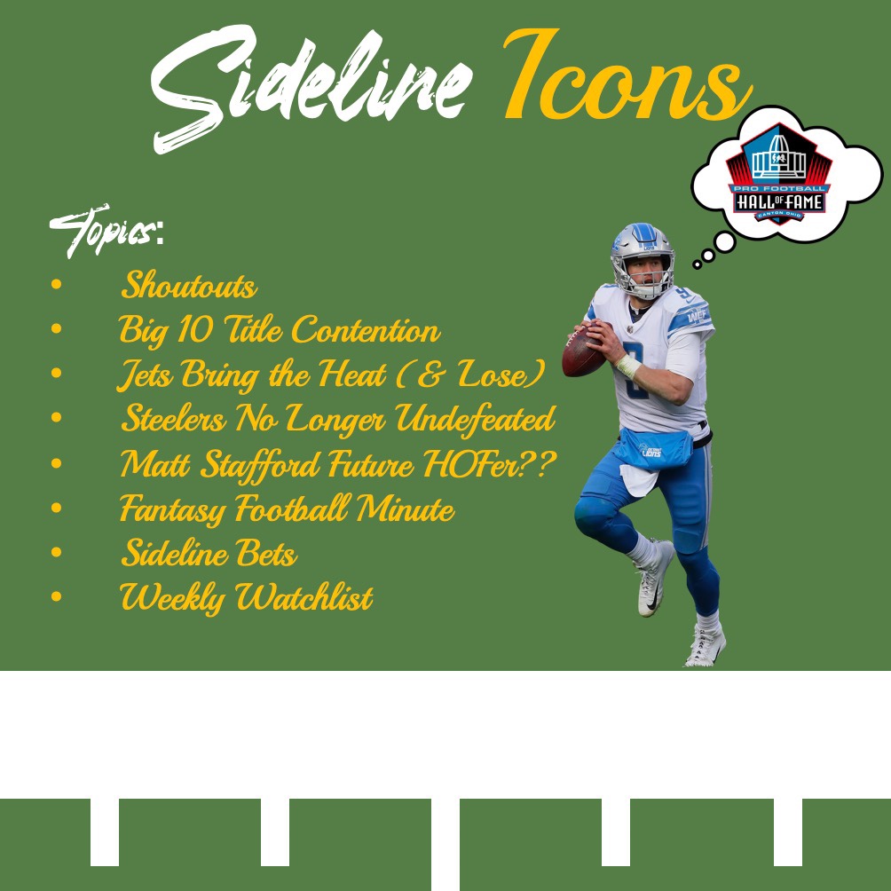 Nick Richter, Tom Rhomberg, and Xavier Sanchez come together to for another episode of Sideline Icons. After struggling to remember what week of the season it is due to scheduling chaos, the trip discuss the best week of game which includes the winless Jets almost getting a win, the undefeated Steelers fall to the Washington Football Team, and even ponder if Matt Stafford is a Hall of Famer or not. They chat fantasy football, give some bets, and even suggest some shows and movies to view while you wait for another episode of the Sideline Icons podcast.