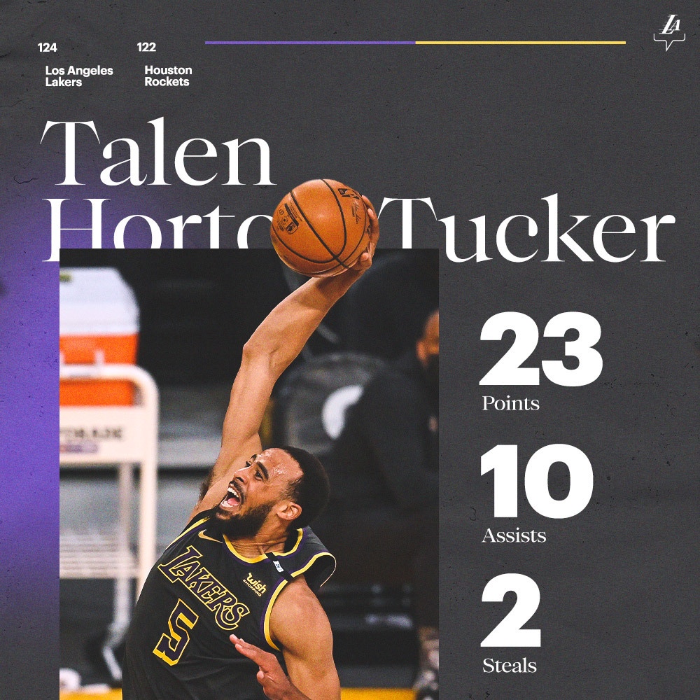 - Talen Horton-Tucker (Simeon/Lakers)- 37 minutes, a team-high 23 points, 9/16 FG, 0/3 3PT, 5/8 FT, 2 rebounds, a team-high 10 assists, a team-high 2 steal (tied with Alfonzo McKinnie), a team-worst 3 turnovers (tied with Kyle Kuzma), and +2 in a 124-122 win over the Rockets.