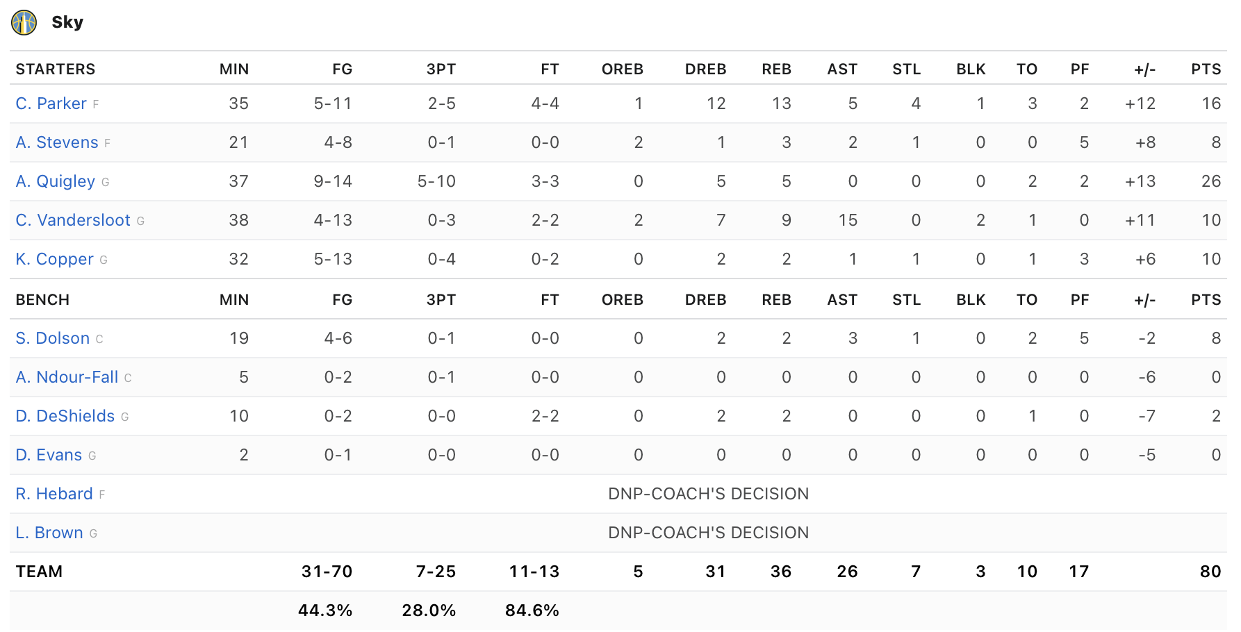 Chicago Sky’s Box Score