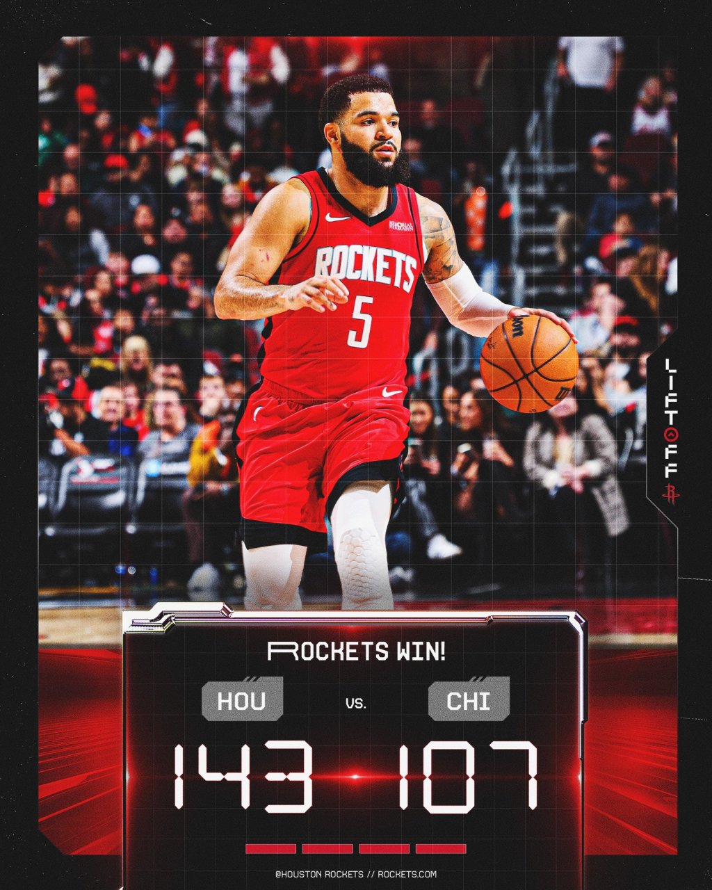 - Houston Rockets defeated Chicago Bulls, 143-107.