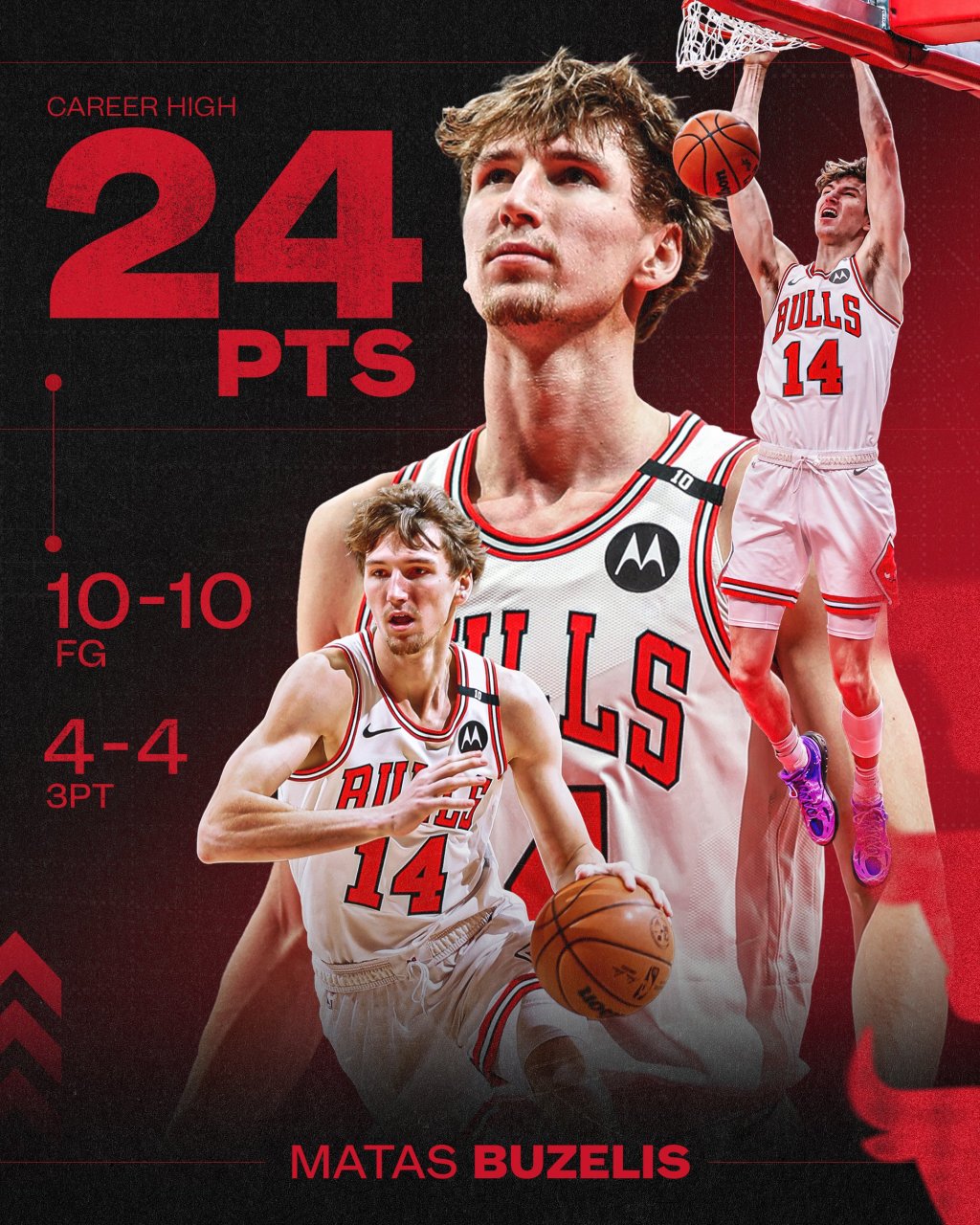 Matas Buzelis (Hinsdale Central) was the star of the nigh for Chicago. He had 24 points on 10-for-10 shooting with Miami’s Bam Adebayo. The third game-high for Buzelis was his two blocks. Buzelis has scored in double digits in four straight games.