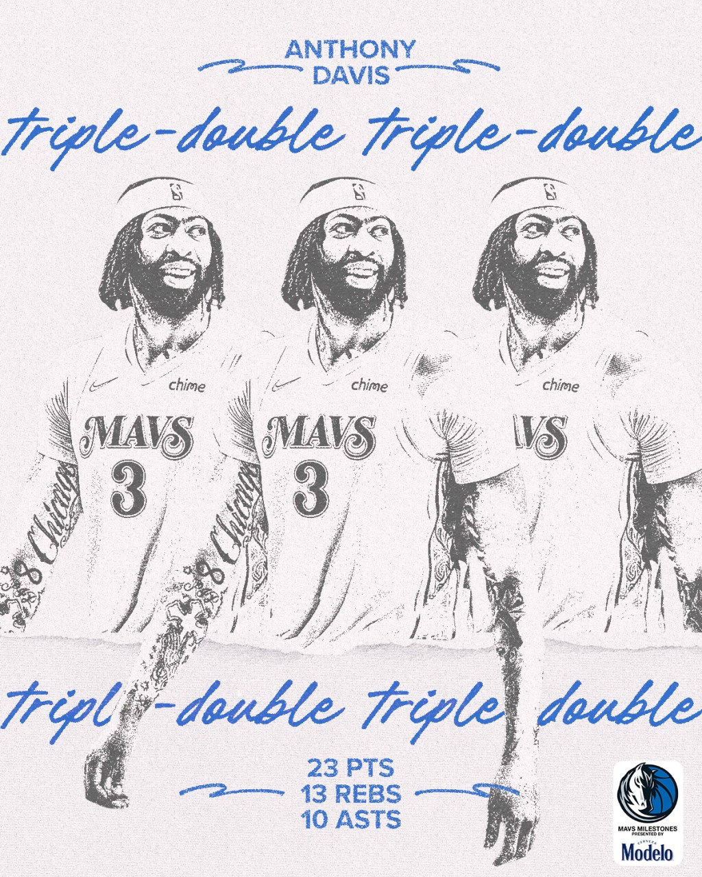 Dallas Mavericks defeated Toronto Raptors, 124-102. Anthony Davis (Perspectives) started and missed a quadruple double by three blocks. He had a team-high 23 points (10-18 FG, 1-5 3PT, 2-2 FT) with a game-high 13 rebounds (three offensive), a game-high 10 assists, a game-high seven blocks, two turnovers, and a +21 plus-minus in 30 minutes. His minutes were a team-high with Max Christie. His field goals and field goals were a team-high. His three offensive rebounds were also a team-high but tied with Dereck Lively II. He out-blocked Raptors 7-4. This was Davis’ first triple double with the Mavs.